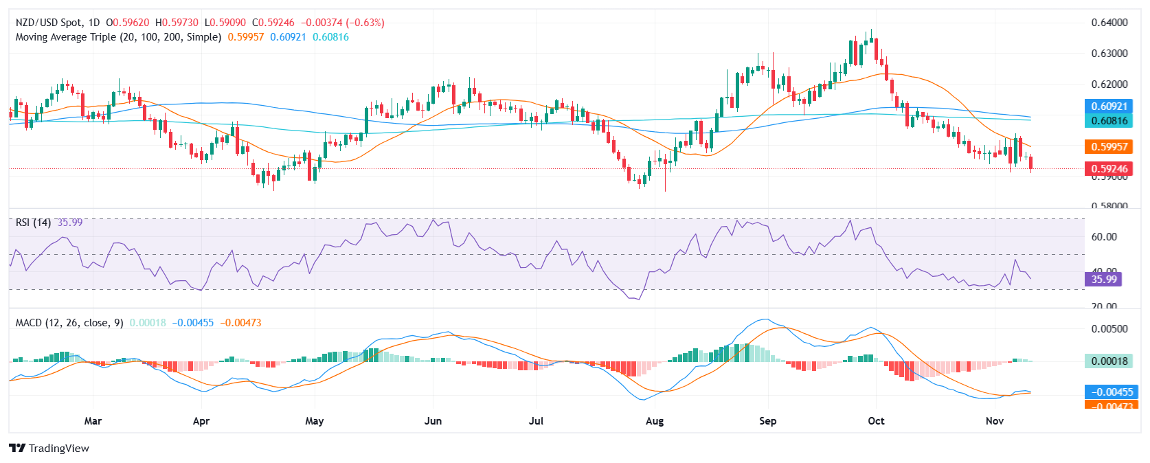 纽元/美元货币对周二延续跌势,下跌 0.68% 至 0.5925,触及 8 月 5 日以来最低水平。跌势重现,技术指标指向进一步走弱。