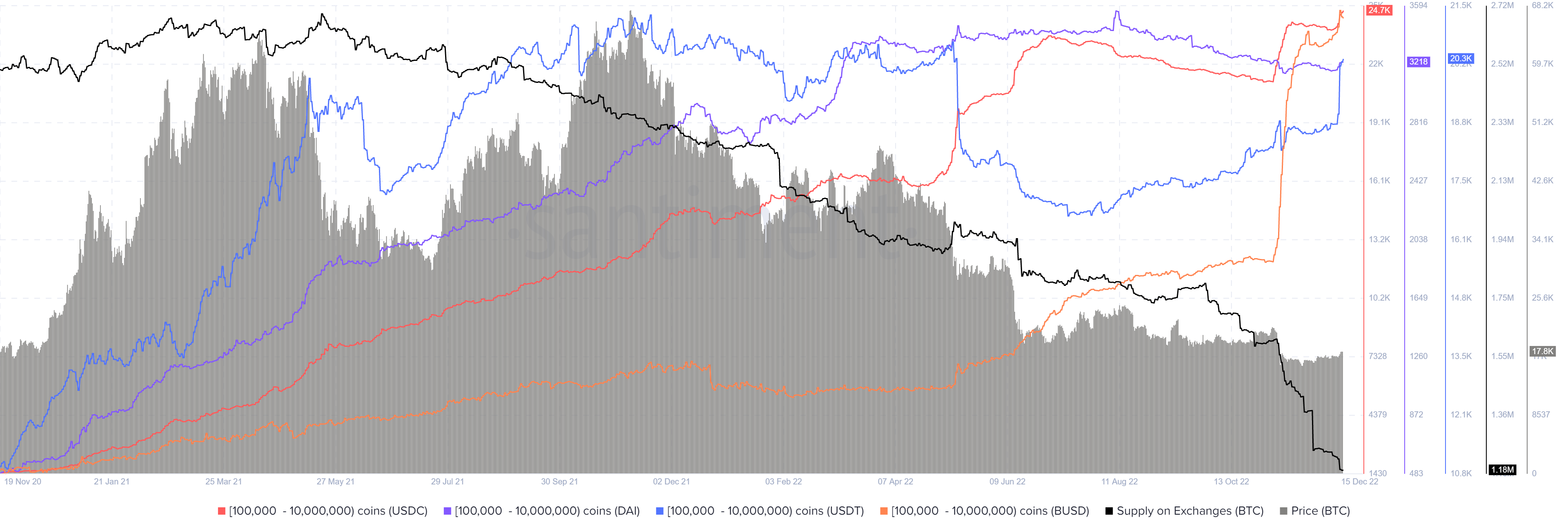 為此,我们将看看持有100,000至10,000,000美元稳定币的地址数量。有关的代币包括--Tether US(USDT)、DAI、USD Coin(USDC)和Binance USD(BUSD)。