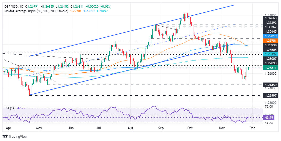 英镑/美元在周内高点附近盘整,在 1.2670 附近录得 0.05% 的小幅跌幅,原因是美国市场因感恩节休市,流动性稀薄。