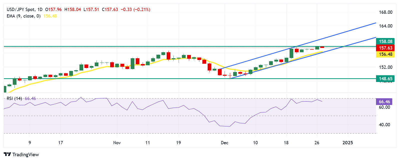 周五,美元/日元在157.70附近交易。日缐图分析显示,货币对在上升通道内继续看涨趋势。14天相对强弱指数(RSI)略低于70水平,强化了看涨前景。突破70水平可能表明超𧹒状态,可能导致货币对出现潜在的下行修正。