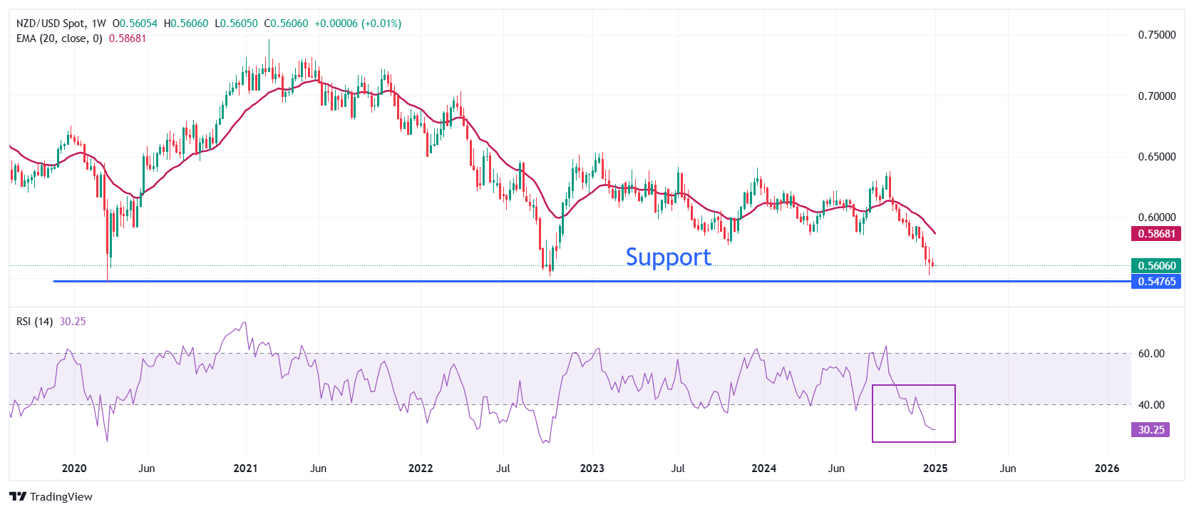 纽元/美元在周缐上的两年低点 0.5520 附近找到了暂时的缓冲。由于交投于 0.5868 附近的 20 周指数移动均缐(EMA)正在下降,纽元/美元的前景依然看跌者。