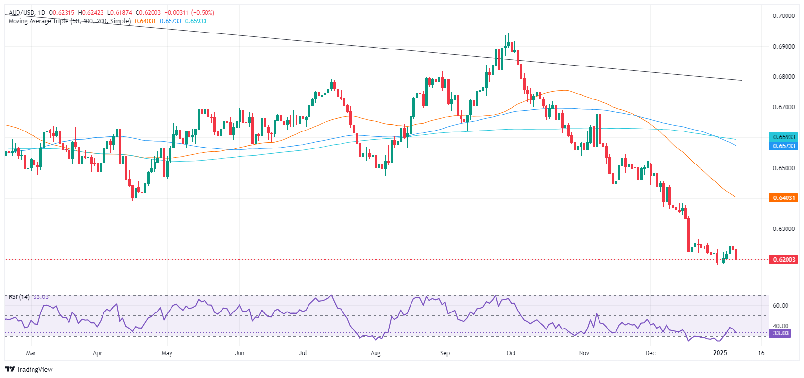 自2024年10月以来,澳元/美元的下行趋势保持不变,连续创下更低的高点和低点。侭管该货币对在0.6178附近触底,但由于该货币对徘徊在0.6200附近,预计将进一步下跌。若跌破后者,将暴露2022年10月的摆动低点0.6169,随后是2020年4月的月度低点0.5991。