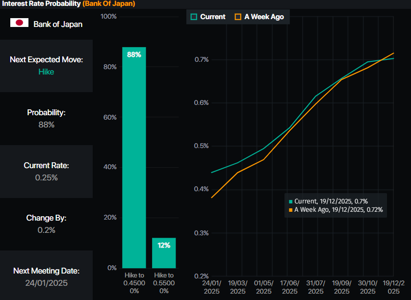 此外,美元/日元交易员关注日本央行(BoJ)下一次货币政策会议。利率概率表明,日本央行可能会将利率上调25个基点至0.50%,这是自去年7月以来的首次加息。