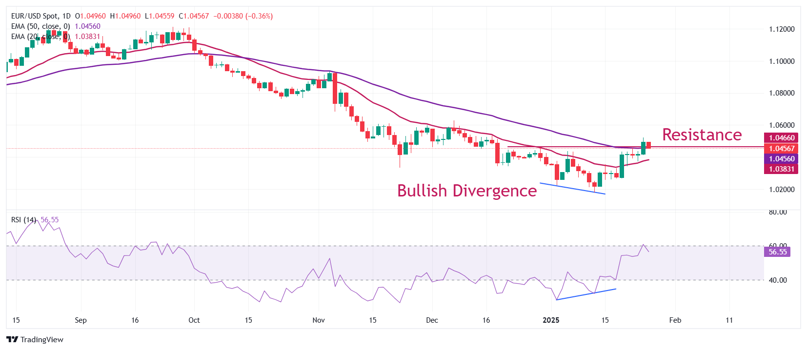 在突破 1 月 6 日高点 1.0437 后,该货币对进入看涨反转,确认了资产价格与 14 日相对强弱指数(RSI)之间的背离。1 月 13 日,RSI 形成了更高的低点,而该货币对则创下了更低的低点。