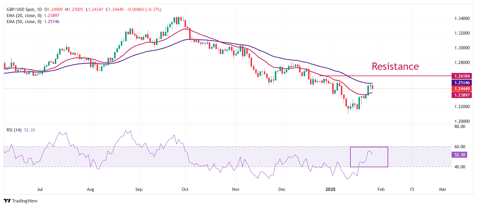 - 疲弱的就业和更高的通胀预计将导致英国经济滞胀。这将对英国央行(BoE)构成更大的风险,英国央行计划于2025年2月6日宣布其首次货币政策决定。交易员预计将降息25个基点(bps),在疲弱的经济前景下将借贷利率推至4.5%。