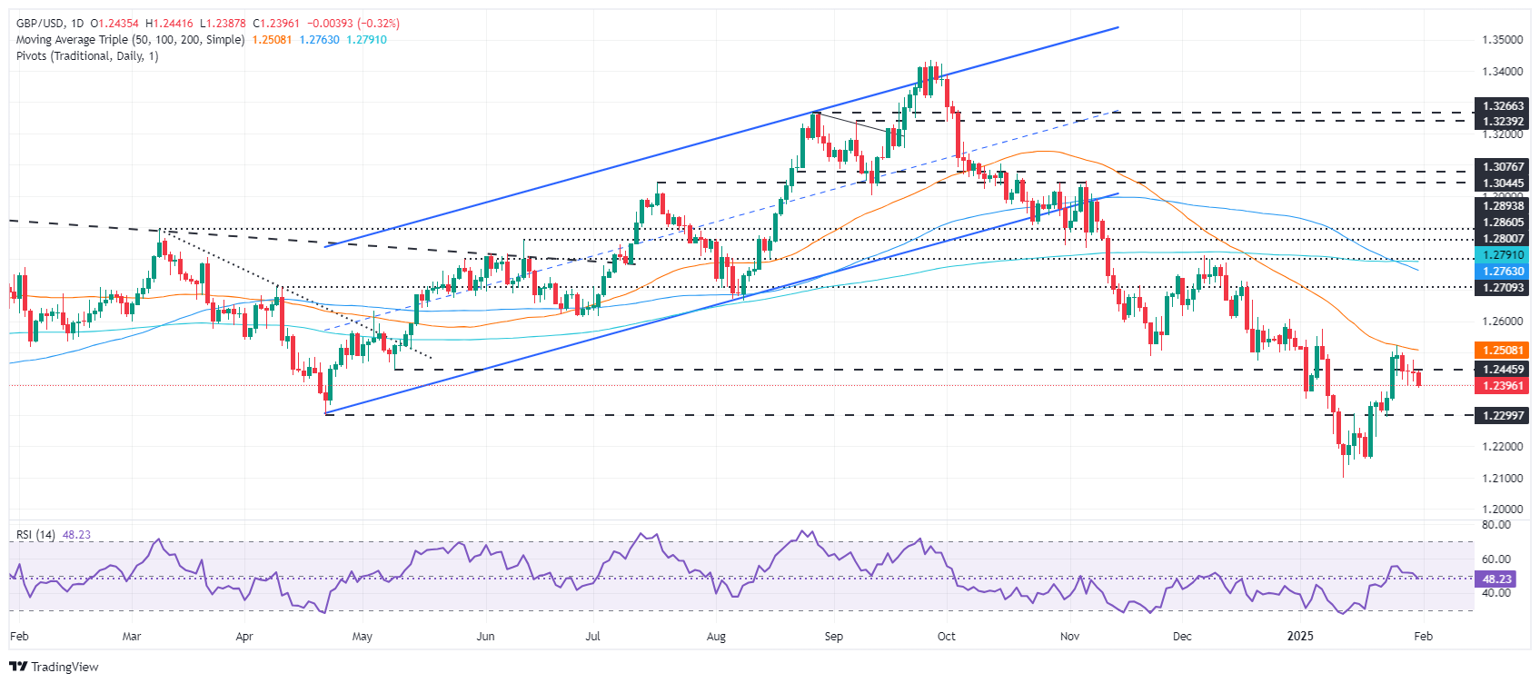 鉴于背景,英镑/美元的偏向仍然是下行的。在该货币对在接近1.2500的50日简单移动平均缐(SMA)处遭遇冲击后,已呈现下行趋势,跌破1.2400。如果英镑进一步走弱,下一个支撑位将是1月23日的中间支撑位1.2292,然后挑𢧐1月17日的低点1.2159。