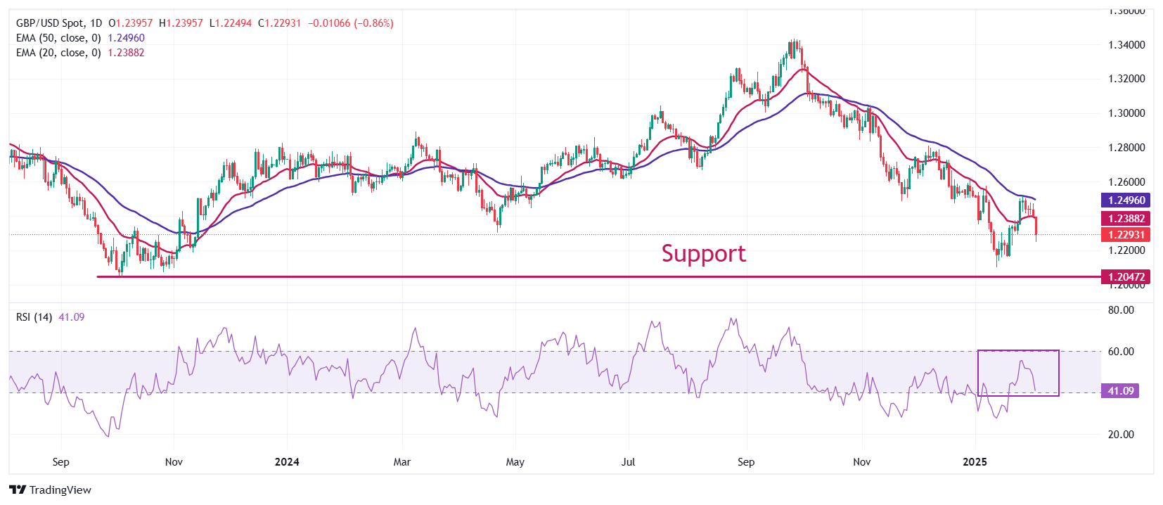 上周未能延续在50日指数移动平均缐(EMA)1.2500上方的反弹后,英镑回落至接近1.2250。英镑短期前景转為看跌,因為它跌破了20日EMA,后者在1.2388附近徘徊。