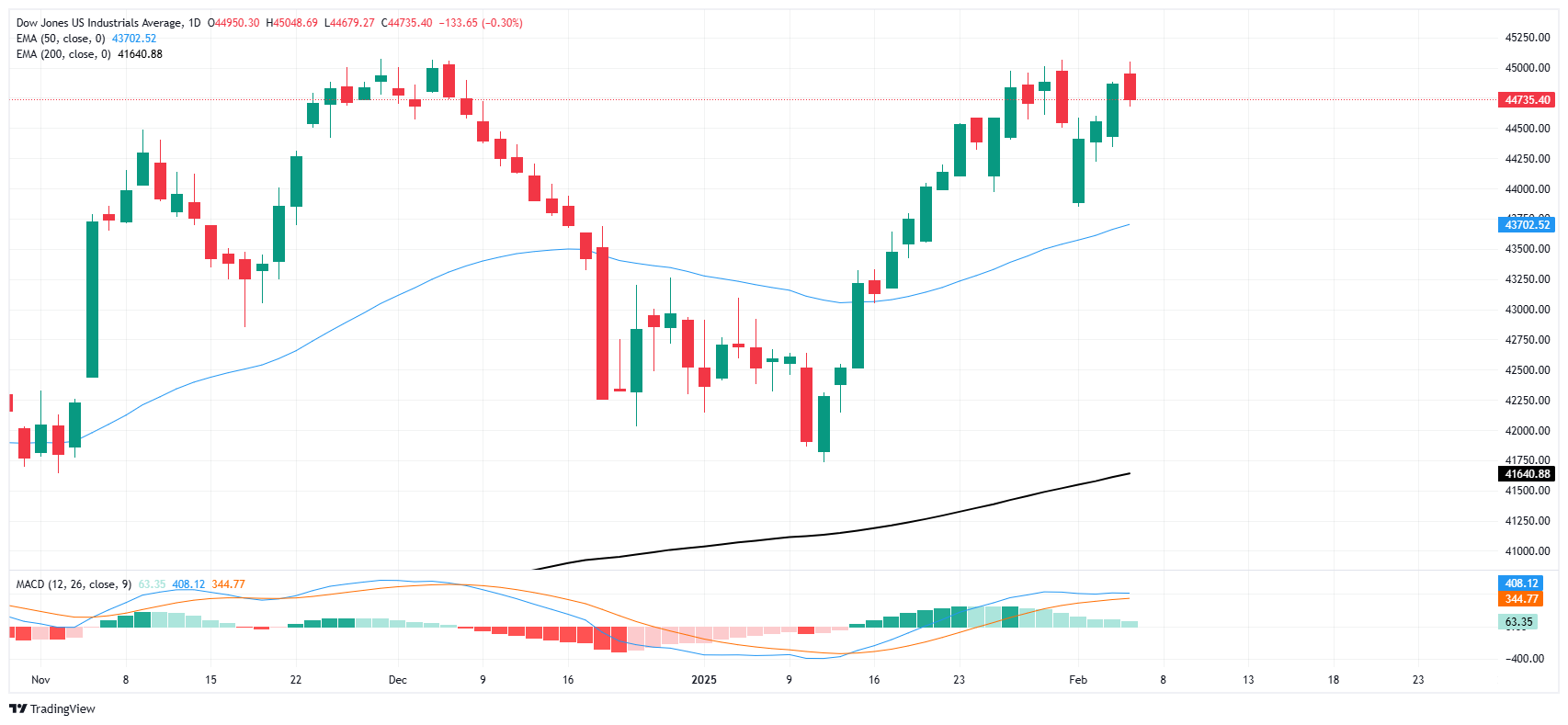 道琼斯指数有望结束三连涨,因為45,000关口对多头来说太滑,难以站稳。侭管周四态度较软,但道琼斯指数顽固地保持在多头区域,2025年迄今上涨5.2%。