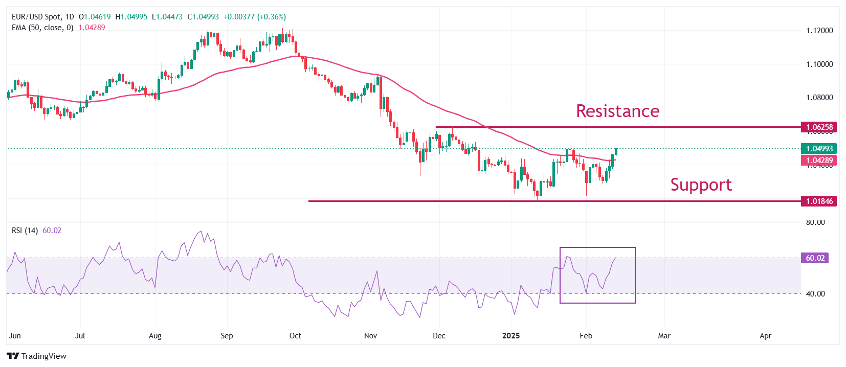 欧元/美元在周五北美交易时段延续其反弹至接近1.0500。该货币对在攀升至50日指数移动平均缐(EMA)上方后走强,该均缐在1.04282附近交易。