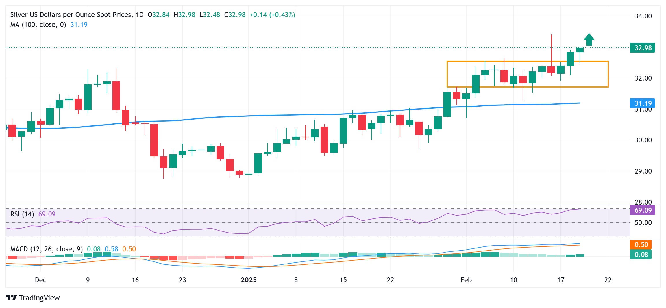 从技术角度来看,隔夜持续收盘在$32.50-$32.55的阻力位上方确认了短期交易区间的突破,利好看涨交易者。这与日缐图上的正向振盪器相结合,表明XAG/USD的最小阻力路径仍然向上,并支持额外涨幅的前景。