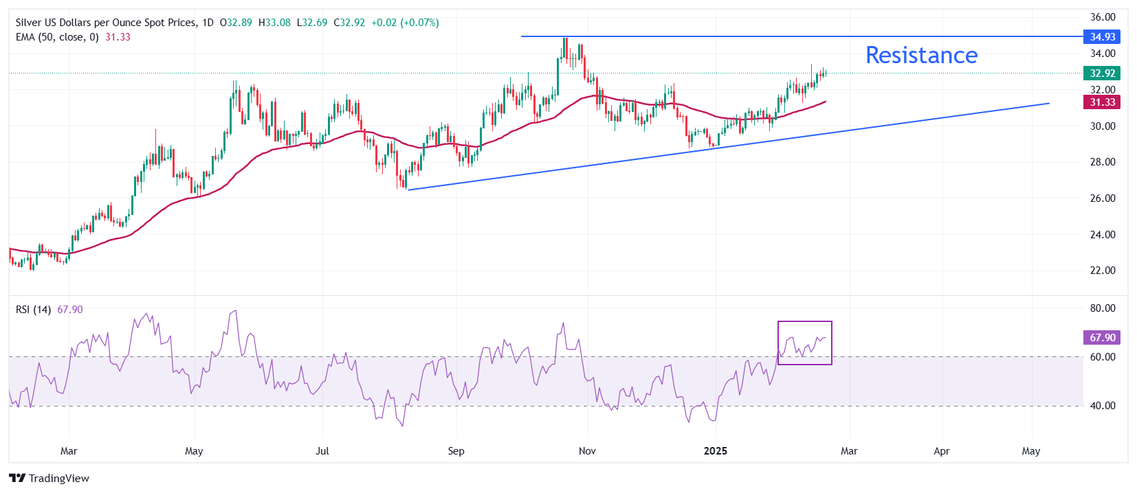 白银价格旨在重新测试2月14日创下的超过三个月高点33.40美元。由于50日指数移动平均缐(EMA)持续上升,白银的前景看涨,目前交易在31.33美元附近。