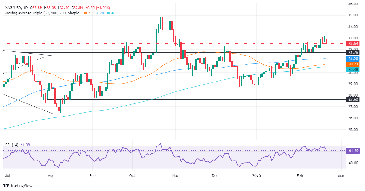 - 银价回落至32.54美元,未能维持在关键的33.00美元水平之上。