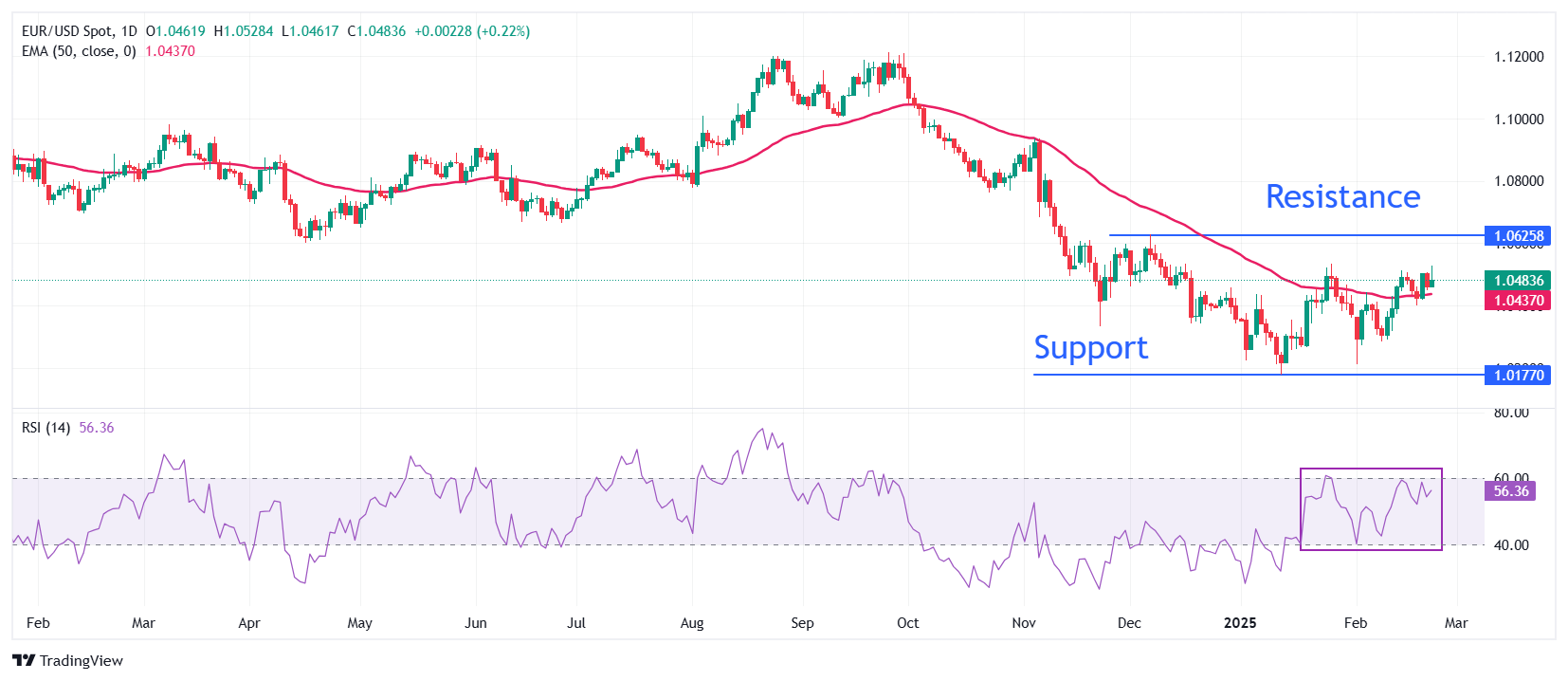 欧元/美元在周一北美交易时段从 1.0530 的日内高点回落至接近 1.0480。50 日指数移动平均缐(EMA)继续在约 1.0437 附近為该货币对提供支撑。