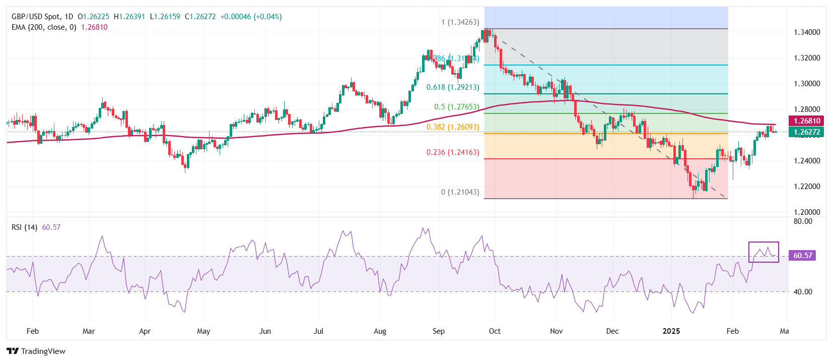 在周二的欧洲交易时段,英镑兑美元在1.2600的关键支撑位上方波动,而200日指数移动均缐(EMA)仍然是约1.2680的主要障碍。英镑/美元在从9月底高点到1月中旬低点的38.2%斐波那契回撤位附近保持在1.2620。