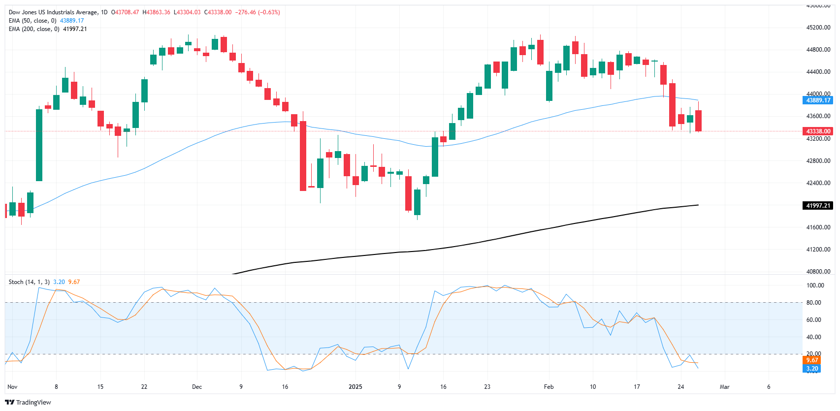道琼斯在周三早盘触及近43,860的三日高点,但主要股指随后被打压,形成了对50日指数移动平均缐(EMA)的新技术拒绝。道琼斯仍在上周五急剧下跌修正后啟动的短期整合模式中交易,但从43,200𫔭始似乎已经定价了一个技术底部。