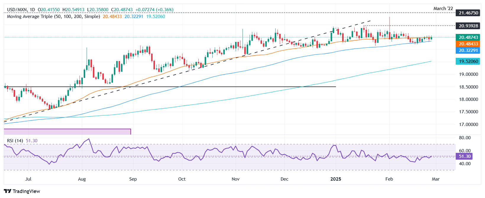 在美国总统唐纳德·特朗普透露将于3月4日对墨西哥和加拿大实施延迟关税后,墨西哥比索(MXN)对美元(USD)贬值。因此,美元/墨西哥比索在接近20.36交易后,升至20.54的日高,然后稳定在当前水平。该异国货币对目前交易于20.42,上涨0.33%