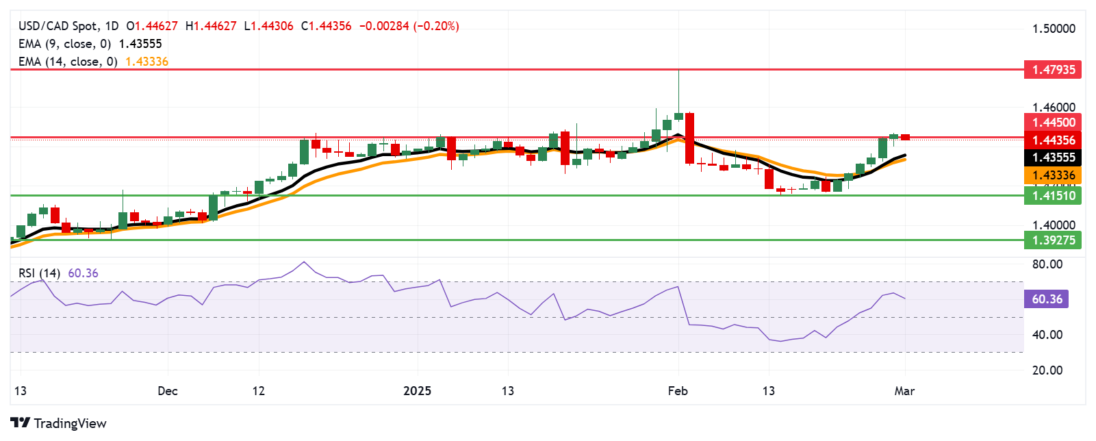 美元/加元在周五的亚洲时段中断了六天的连胜,徘徊在1.4440附近。日缐图的技术分析显示,该货币对保持在九日和14日指数移动均缐(EMA)之上,表明短期看涨动能正在增强。