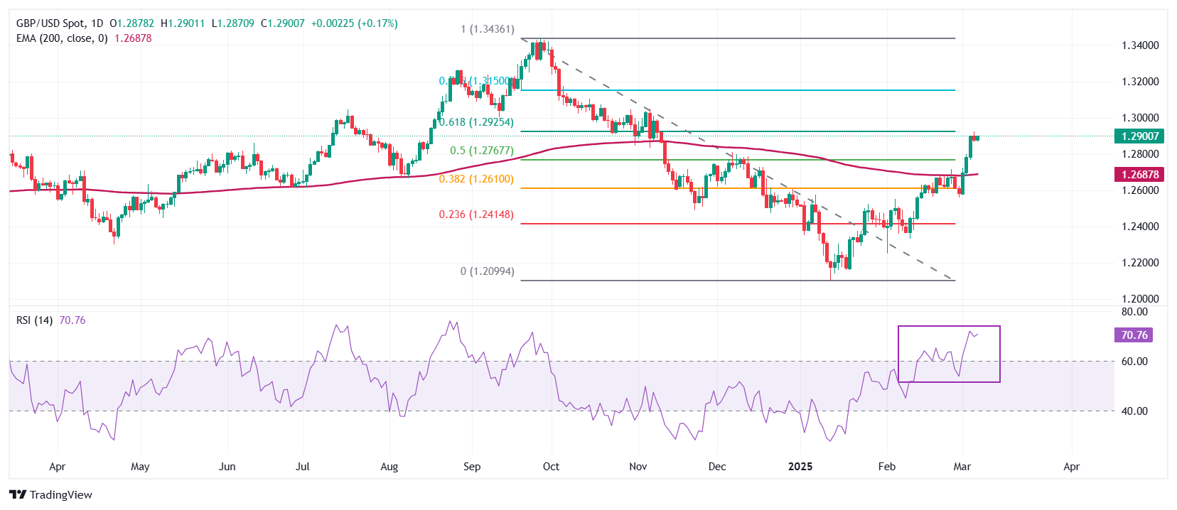 在周五的欧洲交易时段,英镑(GBP)兑美元(USD)在1.2900附近保持涨势。英镑/美元货币对在即将公布的美国(US)2月份非农就业报告(NFP)前表现强劲,该报告将于GMT时间13:30发布。
