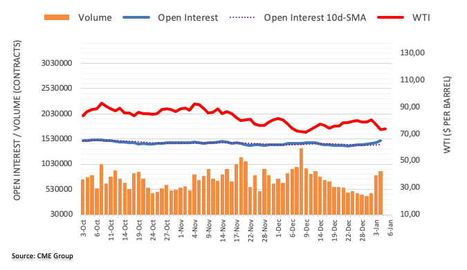周三WTI原油价格大跌之际未平仓合约和成交量萎缩。短期内油价可能进一步回落,短期目标為12月9日触及的2022年低点70美元关口附近。