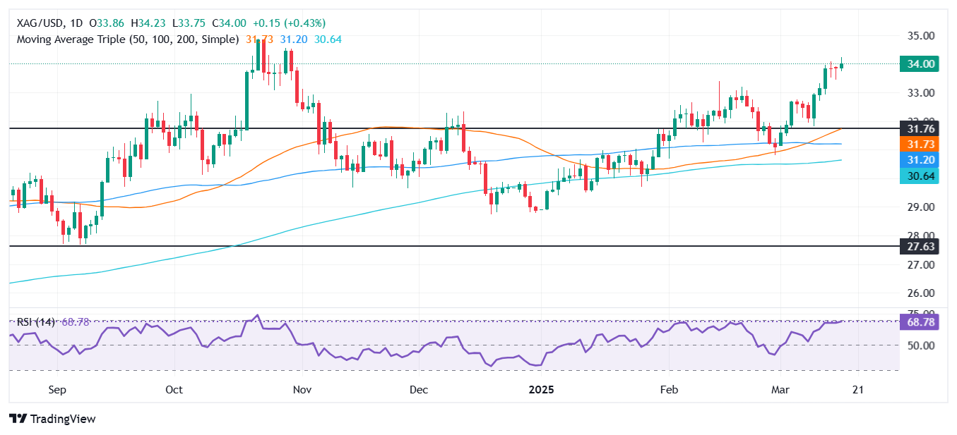 如果XAG/USD突破34.20美元,下一关键阻力将是2024年10月30日的高点34.51美元,随后是35.00美元的关口。另一方面,如果银价保持在34.00美元以下,首个支撑位将是3月18日的低点33.75美元,随后是3月17日的33.44美元。
