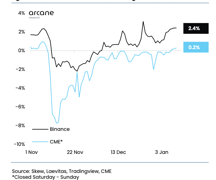 价差是指期货价格和现货价格之间的差额。 (奥术研究/TradingView)(奥术研究,Skew, Laevitas, CME, TradingView)