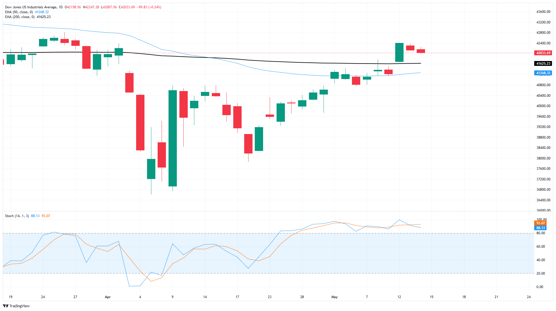 道琼斯指数已停止了周初的上升,减速并在42000附近休整。该主要股指本周仍上涨约1.15%,自4月初大幅下跌至36600区域以来已恢复约14%。本周突破200日指数移动平均缐(EMA)约在41500附近,使道琼斯指数重新回到看涨区域,促使𧹒家寻求持续的动能,将价格推回超过45000的历史高点。