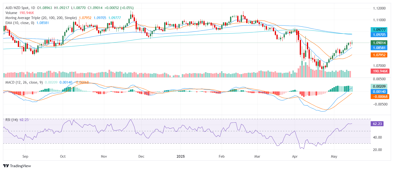 AUD/NZD货币对在周四保持在1.0900区域稳定,反映出市场在进入亚洲交易时的谨慎看涨情绪。价格走势仍在日内区间的中间,表明𧹒方仍在主导,但多个动量指标出现超𧹒条件,增加了短期回调的风险。