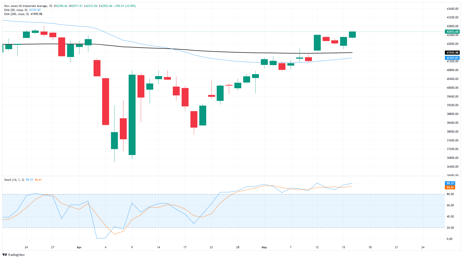 道琼斯工业平均指数终于在自3月以来首次回升至42,500水平。贸易新闻在第一季度将美国股市推入自由下跌,导致道琼斯跌至36,600区域。在经过几周的回调后,DJIA终于回到2025年的正值区域。