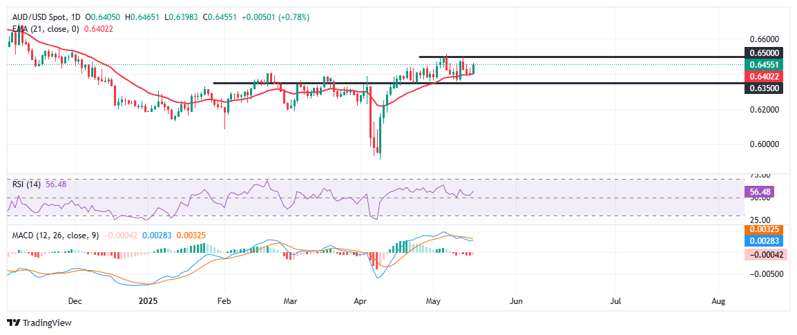 该货币对仍受到0.6402的21日指数移动平均缐(EMA)的支撑,强化了短期看涨的偏向。相对强弱指数(RSI)為56.69,显示出适度的上行动能,而移动平均收敛/发散(MACD)继续在正区域徘徊,侭管动能正在趋平。