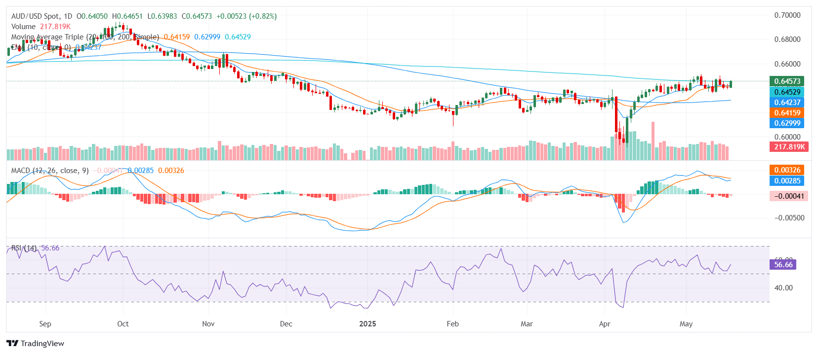 该货币对仍受到21日指数移动均缐(EMA)0.6402的支撑,强化了短期看涨偏向。相对强弱指数(RSI)為56.69,显示出适度的上行动能,而移动平均收敛发散指标(MACD)继续保持在正区间,侭管动能正在趋于平缓。