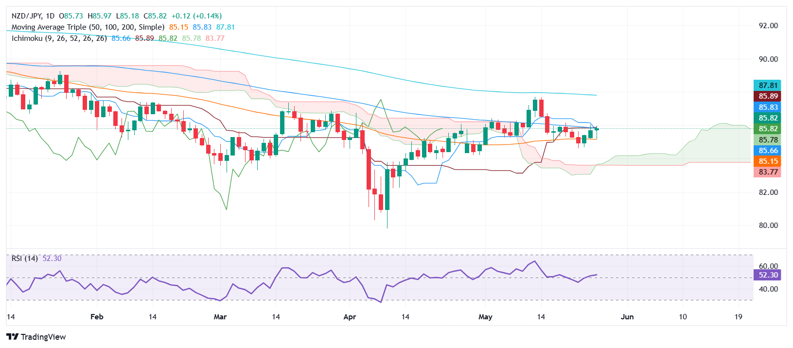 - 纽元/日元交易在一目均衡图云图之上,显示出看涨偏向,但动能仍然犹豫不决。