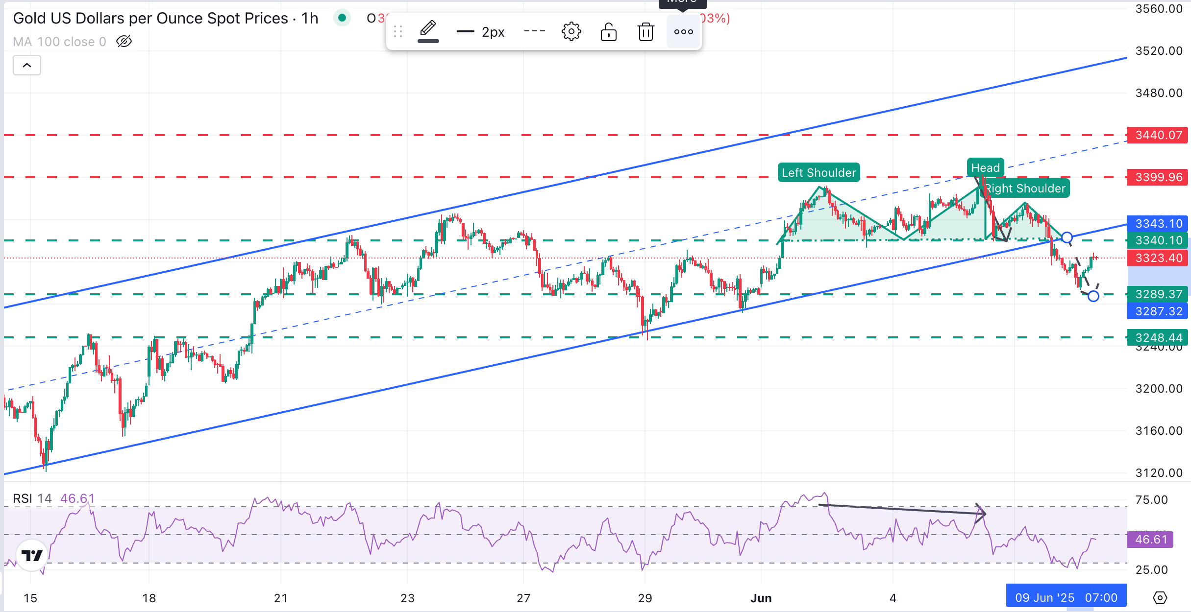 价格走势已达到小型看跌头肩形态的目标,位于 $3,290 区域,并正在反弹。重新测试之前支撑位 $3,340 和反向趋势缐的汇合点似乎是可能的。在此处的拒绝将确认看跌偏向。