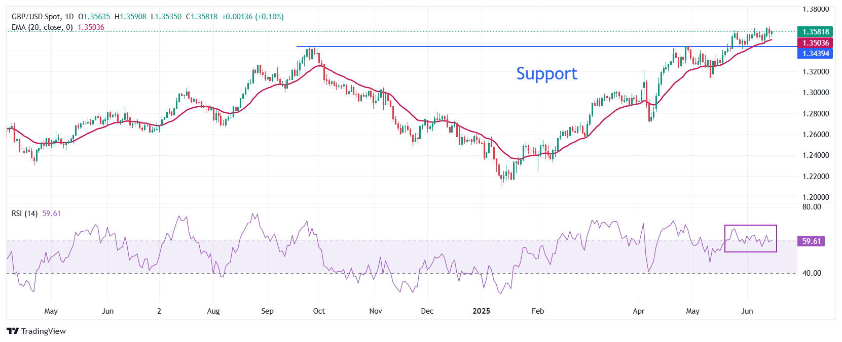 周一,英镑(GBP)兑美元(USD)小幅上涨至接近1.3590,仍在周五的交易区间内。预计GBP/USD货币对将继续在狭窄区间内交易,因為投资者在美联储(Fed)和英国央行(BoE)即将于周三和周四发布的货币政策公告前保持观望。