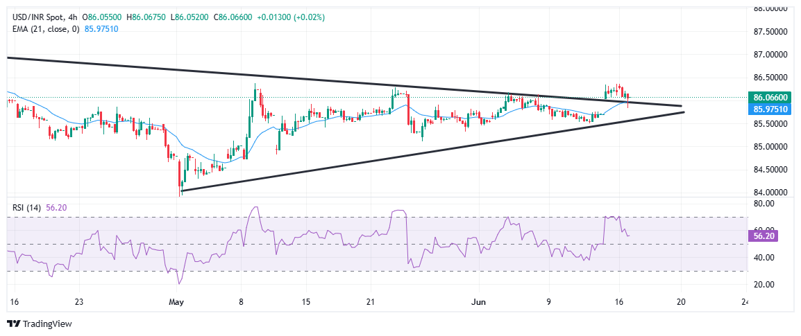 美元/印度卢比最近突破了4小时图上的多周对称三角形模式,发出短期偏向可能转变的信号。然而,在接近86.50后,价格在上方趋势缐附近难以维持动能。目前该货币对在86.05附近徘徊,略高于21期指数移动平均缐(EMA)85.97,表明只要价格保持在该移动平均缐支撑之上,𧹒方仍然略占优势。
