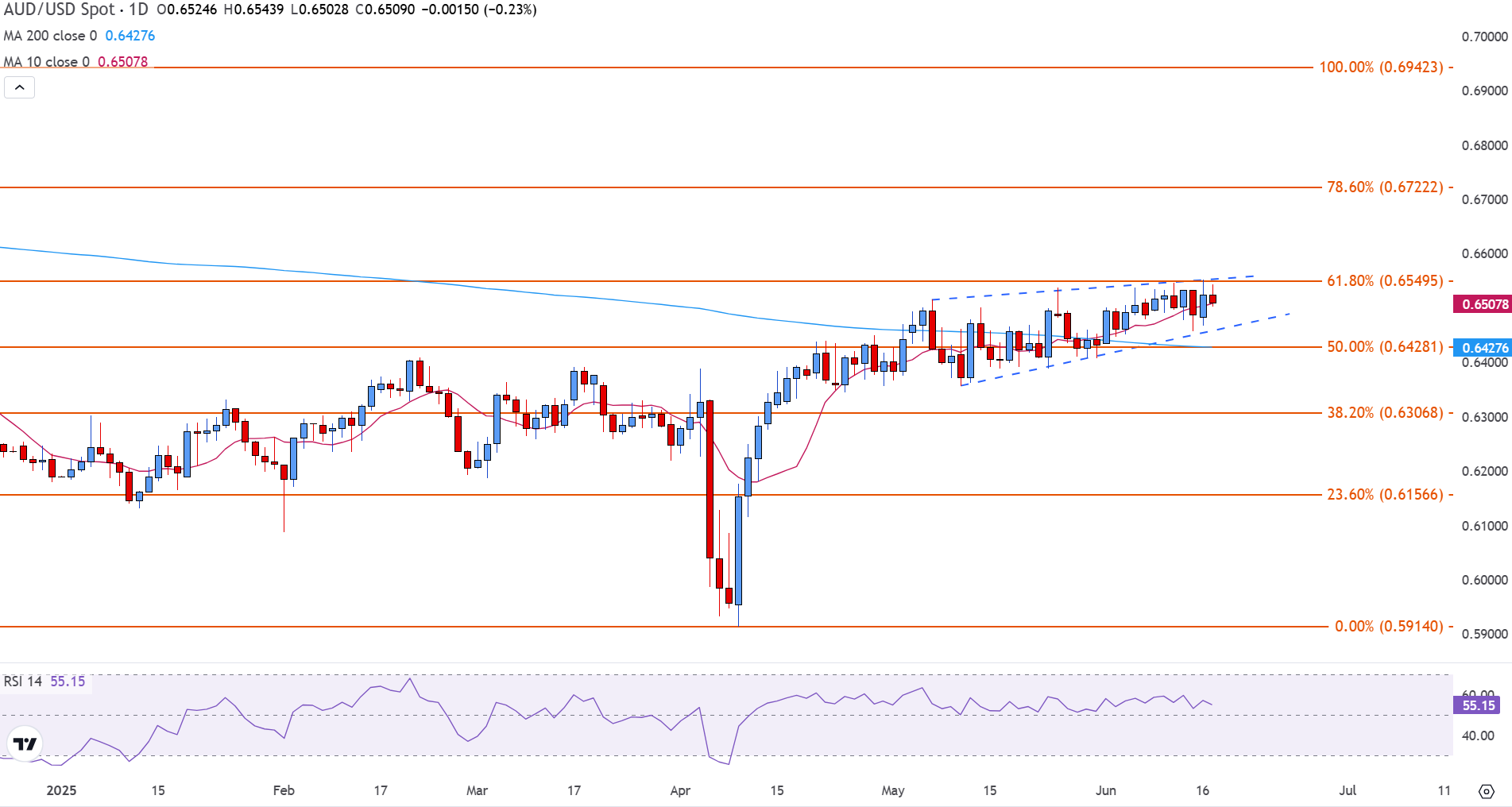 澳元/美元货币对仍被限制在上升楔形形态内,价格在0.6508附近交易,位于关键的61.8%斐波那契回撤位(约0.6550,测量自9月到4月的下跌)。