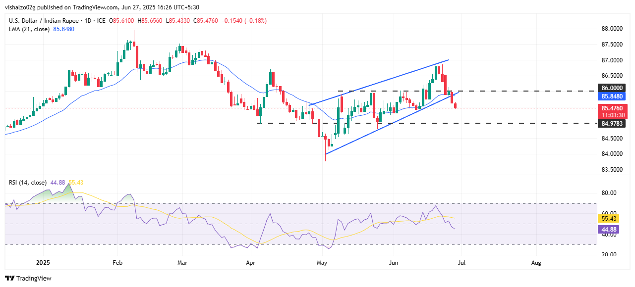 美元/印度卢比(USD/INR)货币对已果断突破自 5 月初以来一直遵循的上升通道下边界,表明空头占据上风。目前该货币对交易于 85.48 附近,跌破 21 日指数移动均缐(EMA)85.84,这是一个看跌的技术信号。