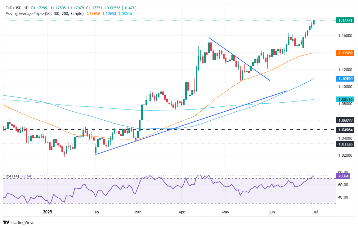 由于美国股指在2025年第二季度表现强劲,创下历史新高,市场情绪依然积极。因此,美元(USD)接近多年低点,因市场预期财政赤字将大幅增加,市场参与者预计美联储(Fed)将放宽超过50个基点(bps),这推动了欧元接近四年高点。