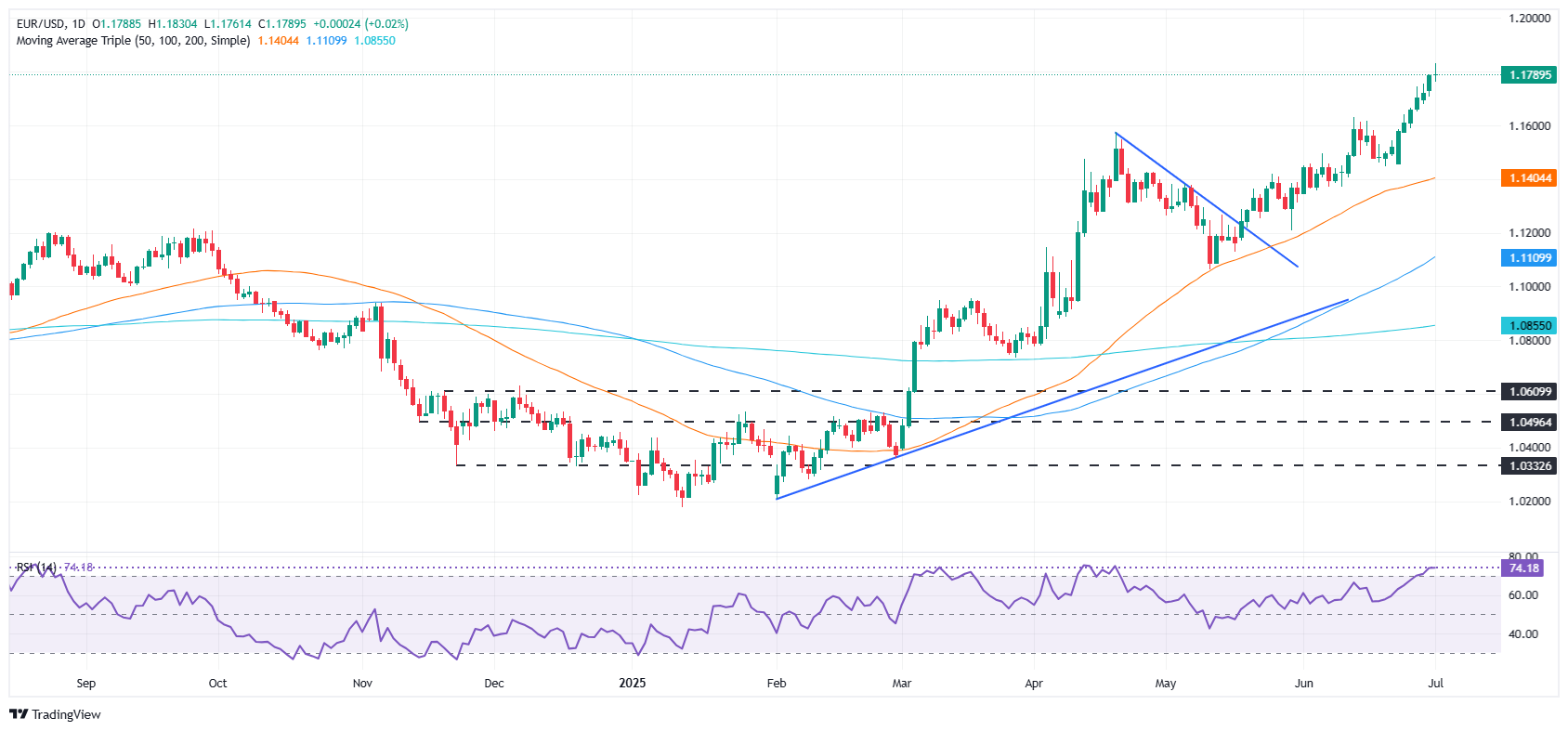 在北美时段,欧元/美元几乎没有变化,在达到多年的高点1.1830后,跌破1.1800水平。美国总统唐纳德·特朗普的"一个美丽的大法案"获得批准,以及美国国债收益率的上升限制了欧元的涨幅,目前交易在1.1780左右,持平。
