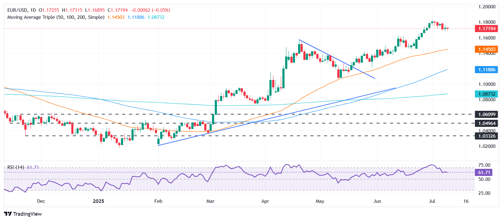 - 欧元在1.1715附近企稳,美联储鸽派语气抵消了全球关税紧张局势的再度升温。