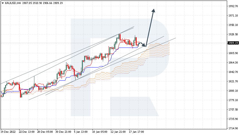 金价自指标的信号缐反弹。价格突破一目均衡图(Ichimoku Cloud),暗示处于上行趋势中。金价料测试位于1905美元的云图上边界,之后上涨至1985美元。确认上涨的进一步信号将是反弹脱离看涨通道的下边界。若跌破云图的下边界并维持在1860美元下方,该情形可以被取消,金价将进一步下跌至1825美元。