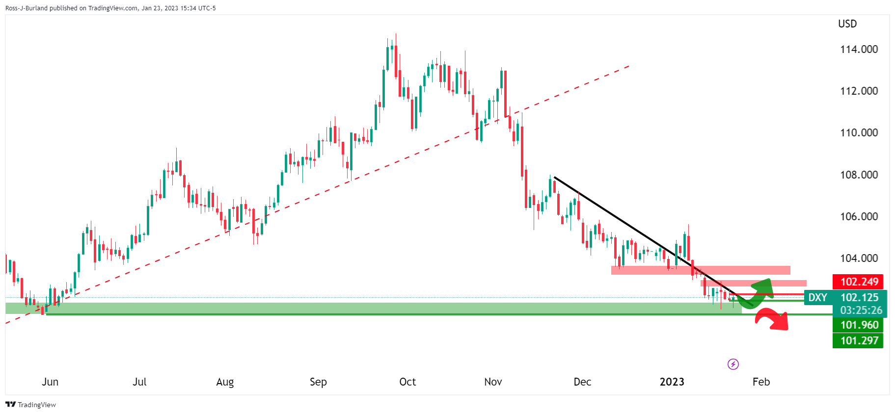 与此同时,美元仍维持承压,处在阻力趋势缐下方: