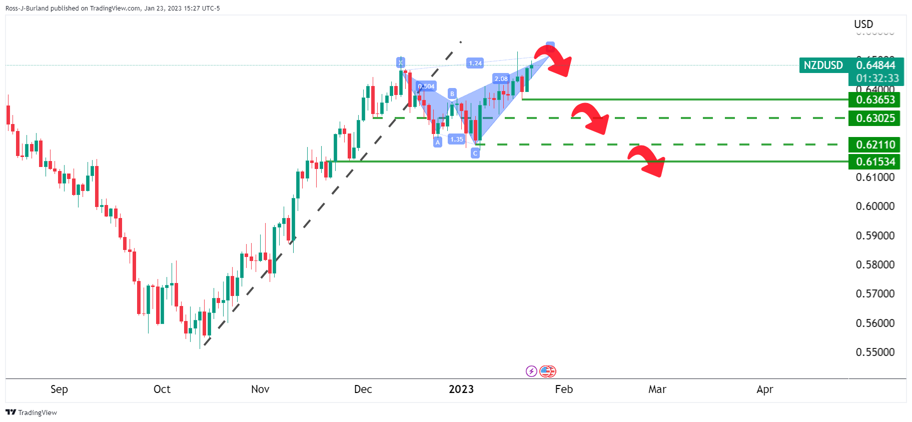 纽元/美元正遇到日缐趋势阻力位,并已脱离谐波形态,有望回归至0.6200: