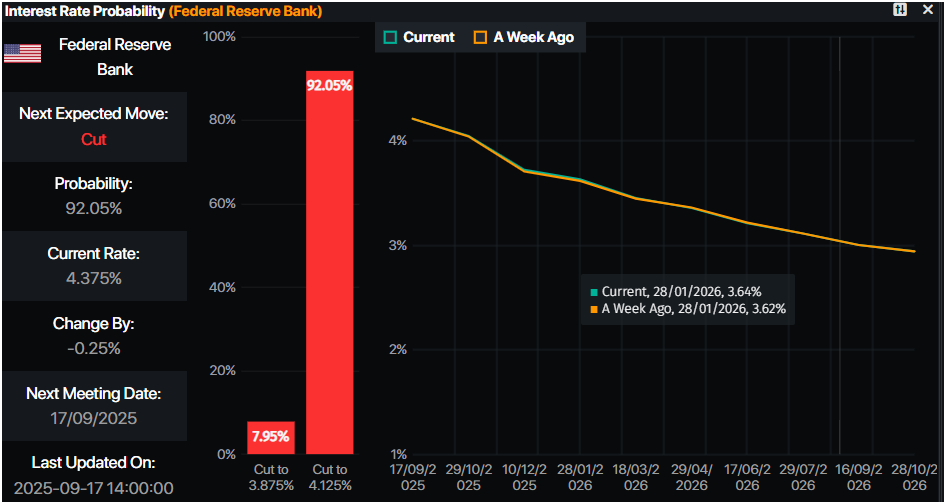 当天晚些时候,美联储预计将利率下调25个基点(bps),至4.00%-4.25%的区间。该决定预计不会是一致的,因為美国总统唐纳德·特朗普的任命者斯蒂芬·米兰可能会推动50个基点的降息。