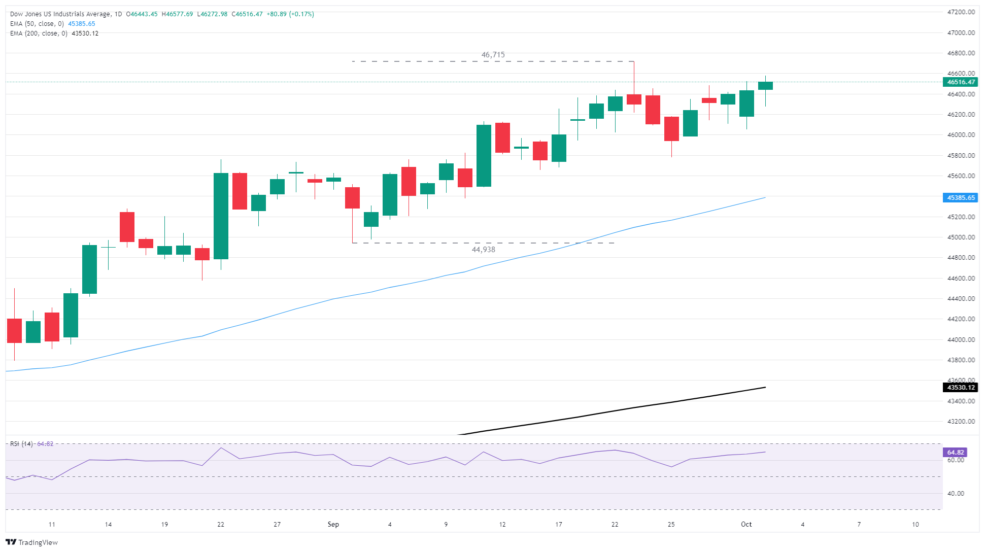 道琼斯工业平均指数(DJIA)在周四小幅上涨约100点,但仍接近46,500区域,因為股市在等待美国联邦政府的停摆。由于劳工统计局(BLS)警告称,政府停摆将导致最新的非农就业数据(NFP)报告被延迟或暂停,预计本周的关键美国劳动和工资数据将不会发布。