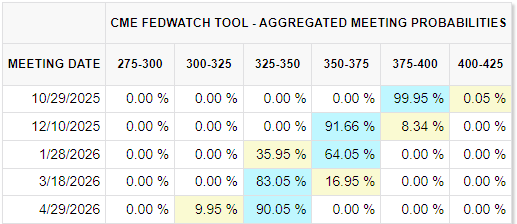 根据芝加哥商品交易所的美联储观察工具,利率市场已完全定价在10月29日进行后续降息的可能性,12月10日进行第三次连续降息的概率超过90%。利率交易员还预计美联储将在明年3月或4月进行第四次25个基点的降息。