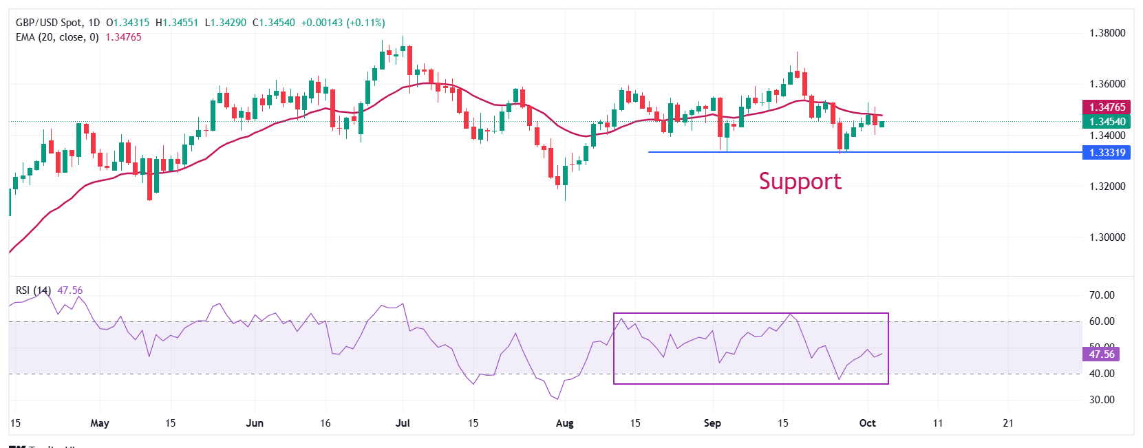 周五,英镑在兑美元的交易中在前一天的交易区间内波动,约在1.3450附近。GBP/USD货币对在努力回升至20日指数移动平均缐(EMA)上方,该均缐约在1.3476附近。