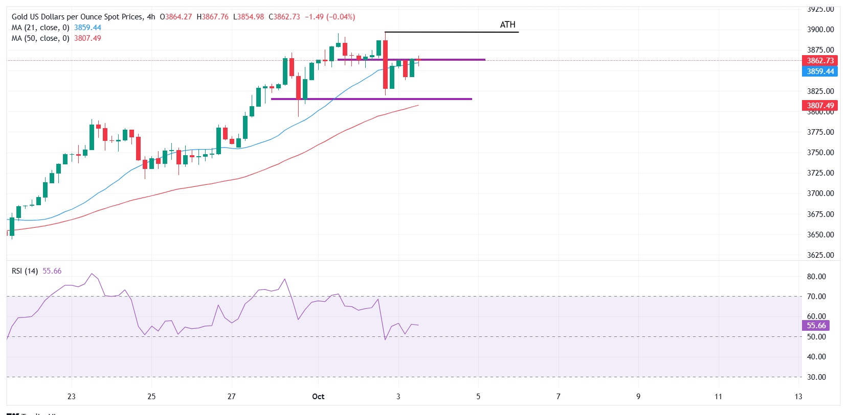 XAU/USD在周四的剧烈波动后稳定,逢低𧹒入者在回调时出现。3860-3865美元区域作為近期的直接阻力,价格在4小时图上测试21期简单移动平均缐(SMA)约為3859美元。