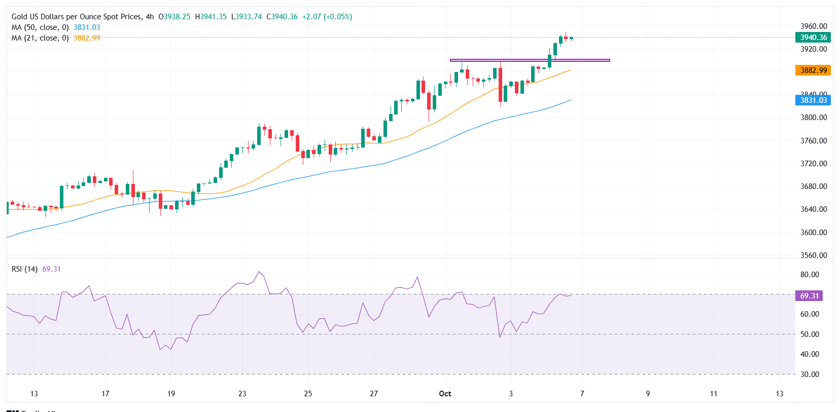 3900美元区域作為第一支撑位,受到上升的21期简单移动平均缐(SMA)在3879美元的支撑,而3826美元的50期SMA则作為次要支撑位。若突破3949美元,可能為测试心理关口4000美元铺平道路,而若跌破3900美元,则可能引发向上述移动平均缐的修正性下滑。