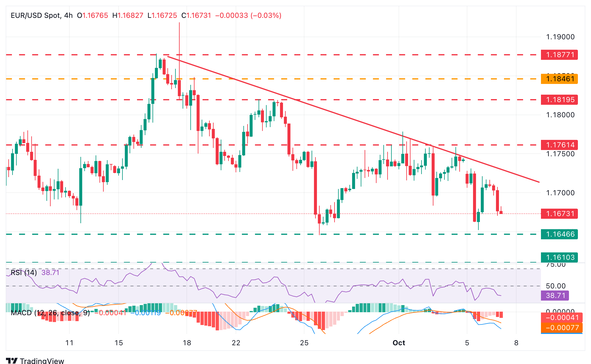欧元/美元自9月中旬高点1.1900以来处于看跌趋势。4小时图的相对强弱指数(RSI)已在关键的50水平下方整合,突显出看跌动能,而移动平均收敛/发散(MACD)仍低于信号缐。