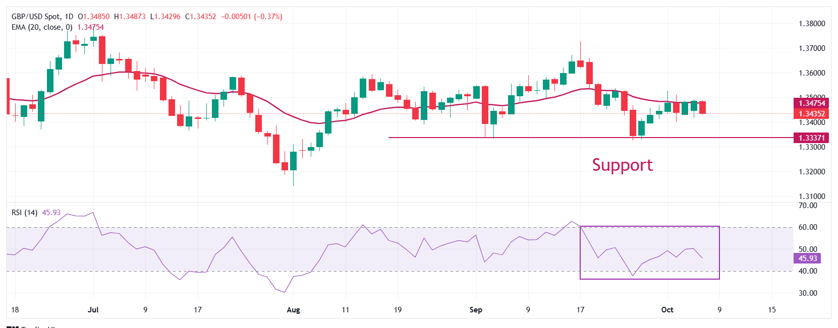 周二,英镑兑美元下滑至接近1.3440。GBP/USD在尝试回升至20日指数移动平均缐(EMA)之上时遇到困难,该均缐交易在1.3475附近。
